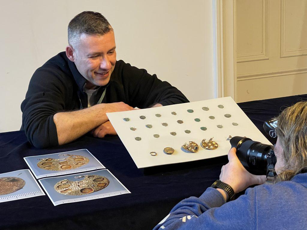 Nicki Andreas Steinmann, the trainee metal detectorist, with his discovery. Photo: ALSH.
