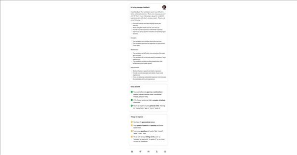 Thanks to these update, SmallTalk2Me users can now improve their interview skills at any time and from any location. Here's how it works: First, users record their spontaneous responses to mock interview questions via SmallTalk2Me's platform. Once the interview is complete, users receive an instant, personalized report analyzing their speech. This report includes individualized feedback from an "AI recruiter," highlighting strengths, weaknesses, areas for improvement. Specifically, the report may address issues related to language use, concrete examples, enthusiasm, as well as grammar, vocabulary, and pronunciation errors. This means that SmallTalk2Me users can benefit from a comprehensive evaluation of their speaking skills and receive tailored guidance on how to enhance their performance, all at their convenience.