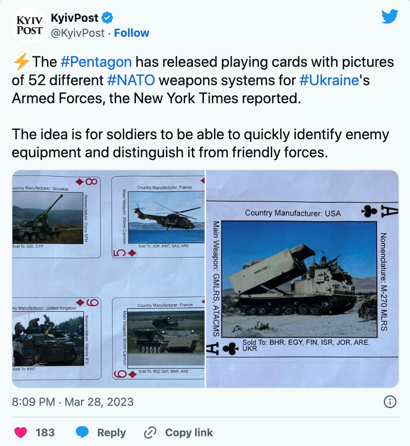According to a report in the new york times , the deck has images of 52 different NATO-made tanks, armored personnel carriers, trucks, artillery pieces and other weapons systems. Major Andrew Harshbarger, of the US Army's training and doctrine command, said the idea was to enable soldiers to quickly“identify enemy equipment and distinguish the equipment from friendly forces.”