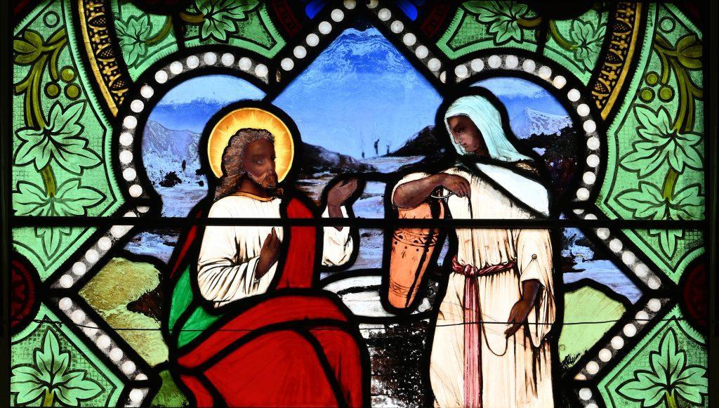Henry Sharp Studio, Jesus with dark skin speaking to the Samaritan woman at the well in a window for St. Mark's Church in Warren, Rhode Island (1877). Photo by Michel Raguin.