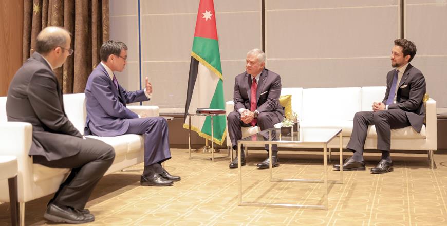 (MENAFN- Jordan Times) TOKYO - His Majesty King Abdullah in Tokyo on Monday met with Economy, Trade, and Industry Minister Nishimura Yasutoshi, Digital Transformation Minister Kono Taro, and Chairman of the Japanese-Jordanian Friendship Association Sasaki Mikio.At the meetings, attended by Their Royal Highnesses Crown Prince Hussein, Prince Hashem, the King discussed expanding economic cooperation between Jordan and Japan, commending the historic friendship between the two countries.