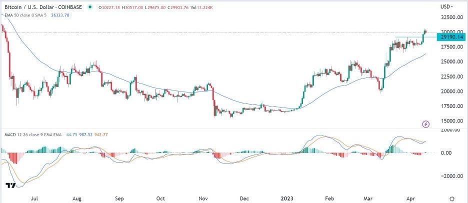 The BTC/USD price remained above the important resistance point at $30,000 after the encouraging American inflation data. It was trading at $30,100 on Thursday morning, meaning that it has jumped by over 96% from the lowest point in 2022.Fed minutes and US inflationThe main catalyst for Bitcoin and other cryptocurrency prices is monetary policy. Most investors believe that the Federal Reserve will join other centrral banks to pause hikes in the near term. Already, central banks in countries like Canada, Australia, and India have all paused their rate hikes. All of them have argued that the pause was necessary and that they will be ready to tighten more if inflation remains stubbornly high.It seems like conditions in the US are conducive for a pause as well. Data published last week showed that wages continued dropping even as the unemployment rate remained at a multi-decade low. Additional data revealed that manufacturing and services PMIs dropped in March.Meanwhile, on Wednesday, data from the Bureau of Labor Statistics showed that the country's inflation continued dropping in March. The headline inflation dropped to 5.0% in March from a year earlier and to 0.2% on a monthly basis. This decline was bigger than what most analysts were expecting.Therefore, there is a likelihood that the fed will pause its rate hikes after the meeting in May. In fact, minutes published on Wednesday showed that some Fed members considered pausing interest rate hikes in a bid to watch the situation in the banking sector. The Fed also warned that the country will likely have a mild recession later this year. As such, it will be a bit difficult for the bank to hike rates in a period of recession. The minutes said: “Several participants emphasized the need to retain flexibility and optionality in determining the appropriate stance of monetary policy given the highly uncertain economic outlook.” BTC/USD technical analysisThe daily chart shows that the BTC/USD exchange rate continued rising in the overnight session as hopes that the Fed will change its posture rose. The pair remained above the key resistance at 30,000 and 29,190. It is supported by the 50-day and 200-day moving averages while the MACD is above the neutral point. Therefore, in this case, the trend is your friend, meaning that the pair will likely continue rising in the near term. However, a pause cannot be ruled out as some traders start taking profits. Ready to trade our