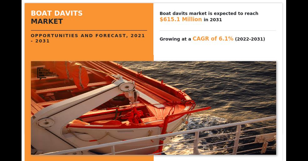 PORTLAND, OREGON, UNITED STATES, April 14, 2023 /einpresswire.com / -- Allied Market Research recently published a report, titled, "boat davits market by Type (Gravity roller track davit, Single pivot gravity davit, Free fall davit, Quadrantal davit), by Mode (Passenger Vessel, Commercial Boats, Others), by Material (Aluminum, Steel, Composites), by Application (Seawall Mount Davits, Dock Mount Davits, Pile Mount Boat Davits), by Propulsion (Electric, Manual), by Weighing Capacity (Less than 1000 Pound, 1000 to 4000 Pound, More than 4000 Pound): Global Opportunity Analysis and Industry Forecast, 2021-2031." As per the report, the global boat davits industry was estimated at $347.5 million in 2021, and is set to reach $615.1 million by 2031, growing at a CAGR of 6.1% from 2022 to 2031. The report offers a detailed analysis of changing market trends, top segments, key investment pockets, value chains, regional landscapes, and competitive scenarios.
