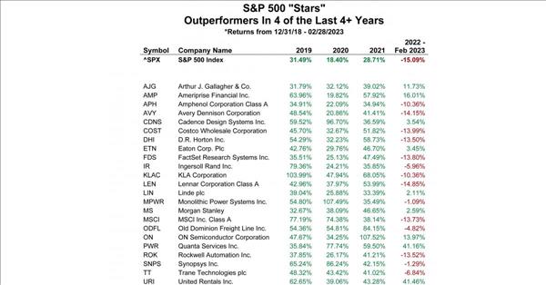 WASHINTON, DC, UNITED STATES, April 18, 2023/einpresswire.com / -- 23 stocks in the s&p 500 have consistently beaten the performance of the S&P 500 on an annual basis over 4 of the past 4+ years. At stoxxusa.org , our equity analysis team has identified these StoxxUSA "Stars" which have beaten the S&P in 4 of the past 4+ year.