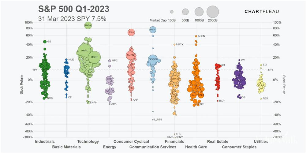 In fact, seven of the 10 worst performers on the index to start 2023 are banks or financial companies. The visualization shows the ripple effect on the market after the collapse of regional banks in March, and the ensuing rout driving the entire sector down 5.6% year-to-date.