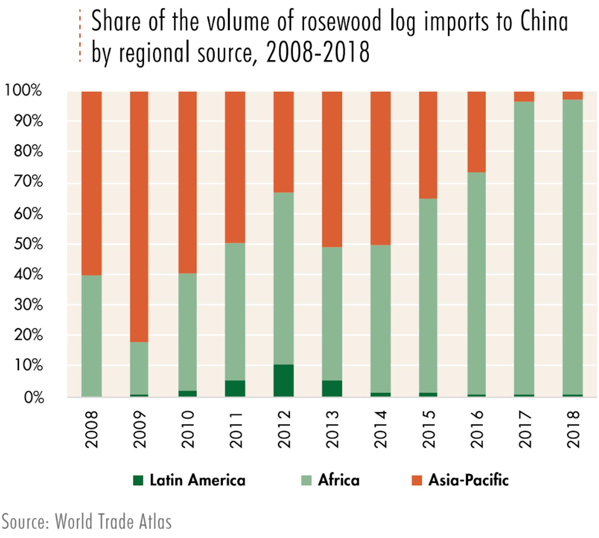 Illegal logging is most prevalent in the continent's tropical rainforests. Foreign demand for rare hardwoods from these forests has dramatically increased . A significant driver is Chinese demand for teak, redwood and mahogany. According to the United Nations Office on Drugs and Crime, Africa's share of rosewood exports to China rose from 40% in 2008 to 90% in 2018.