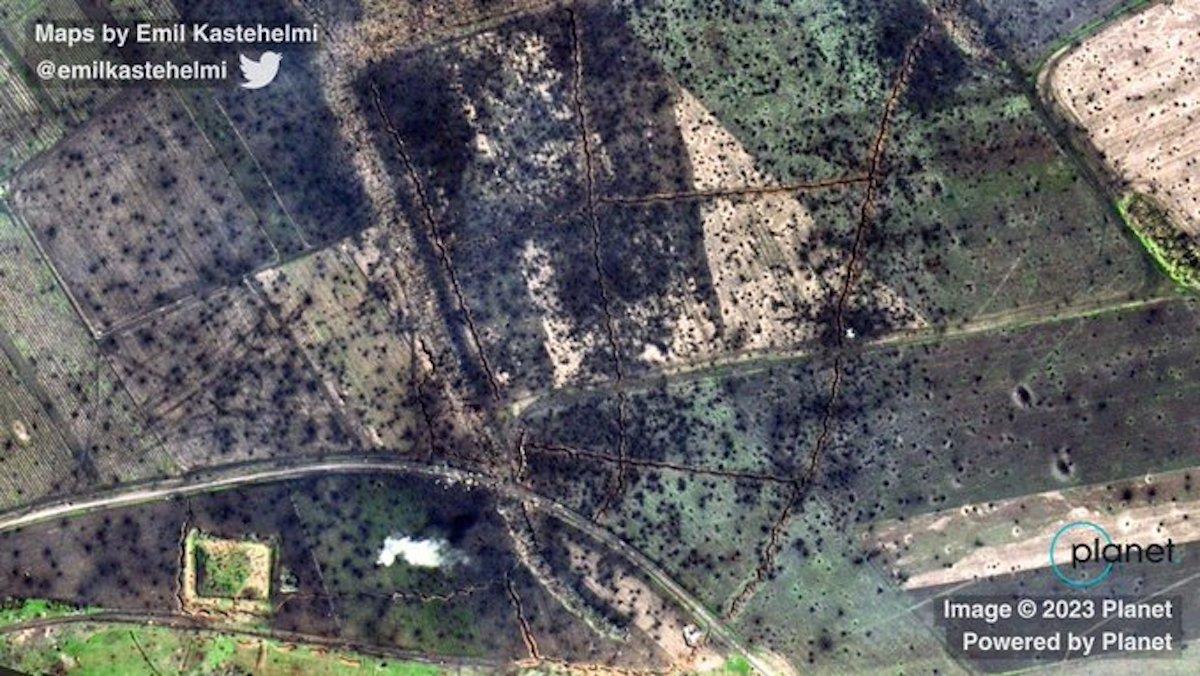 Trenches and fields near the Ukrainian roadway O0506 road past Khromove, north of Bakhmut. Notice how the trenches have been hit by artillery fire. Map: uacontrolmap.com