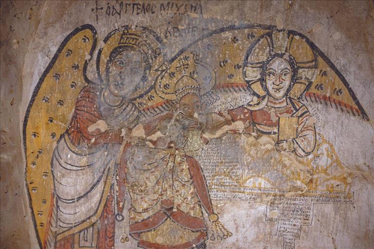 The wall painting portrays the archangel Gabriel embracing a royal figure who is himself kissing the hand of Jesus, emerging from a cloud.“When mortals are in contact with saints or Christ, especially in Late Antique art, the contact is not direct. Mortals hold a cloth or shawl through which the contact is maintained,” Obłuski says.