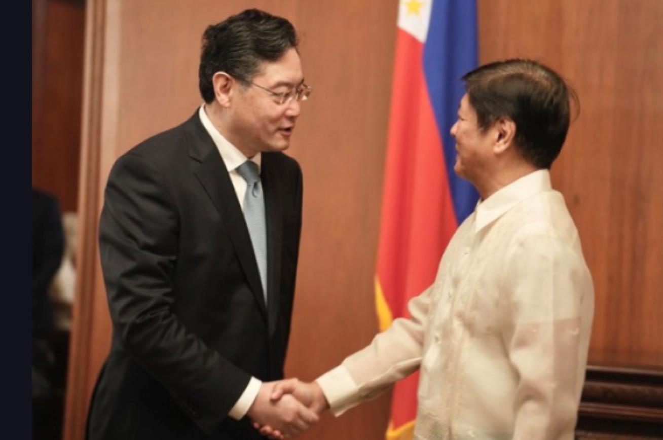 Chinese Foreign Minister Qin Gang and Philippine President Ferdinand Marcos Jr in an uneasy embrace, April 23, Manila. Image: Handout