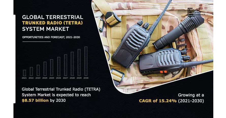 PORTLAND, OR, UNITED STATES, May 12, 2023 /einpresswire.com / -- According to a new report published by Allied Market Research, titled,“Terrestrial Trunked Radio (TETRA) System Market by Application, Industry Vertical, and Region: Global Opportunity Analysis and Industry Forecast, 2022–2030", the global terrestrial trunked radio (TETRA) system market size is expected to reach $8.57 billion by 2030 from $2.14 billion in 2020, growing at a CAGR of 15.24% from 2021 to 2030. The report offers a detailed analysis of changing market trends, top segments, key investment pockets, value chain, regional landscape, and competitive scenario. The current business scenario has experienced rapid development in TETRA technology. Factors such as growth of advance communication in the industrial sectors, technological advancements, and increasing demand for mission critical communication drive the terrestrial trunked radio (TETRA) system market growth.
