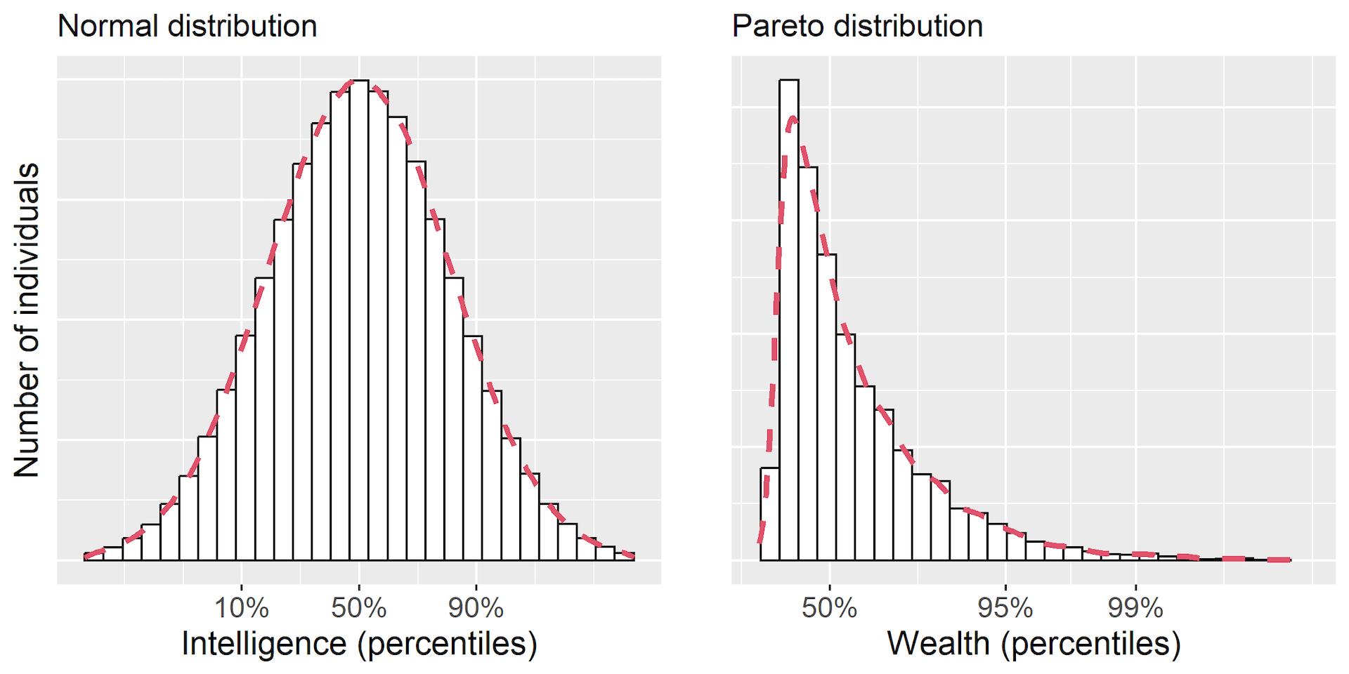 This study highlights that the statistical distribution of wealth differs from the distribution of intelligence. Intelligence is“normally distributed”, with most individuals being around average. By contrast, wealth follows a“pareto distribution”, a formula which shows that 80% of a country's wealth is in the hands of only 20% of the population.