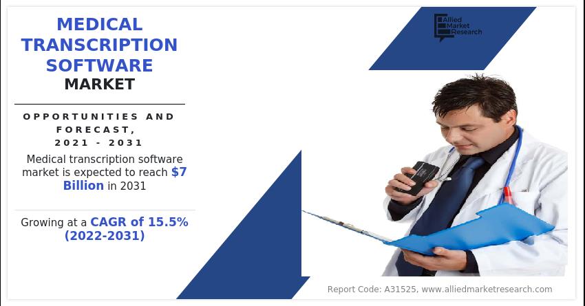 PORTLAND, OREGON, UNITED STATES, June 19, 2023/einpresswire.com / -- The medical transcription software market size was valued at $1.6 billion in 2021, and is estimated to reach $7 billion by 2031, growing at a CAGR of 15.5% from 2022 to 2031.