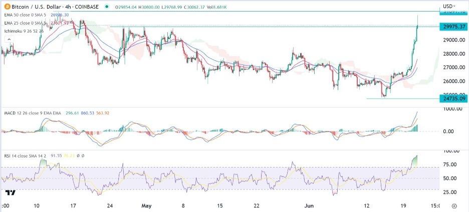 the btc/usd pair continued rebounding as sentiment in the crypto industry improved. bitcoin price crossed the important resistance point at $30,000, which was much higher than this month's low of $24,735.fear and greed risebitcoin prices continued rising as sentiment in the crypto industry jumped. data shows that the crypto fear and greed index jumped to the greed zone for the first time since may this year. the fear and greed index by cnn money soared to the extreme greed zone of 75.greed in the crypto industry has been fueled by the recent decisions by large companies to seek exposure to the industry. last week, blackrock announced that it had filed for the ishares bitcoin trust. if accepted, it will be the first etf for spot bitcoin.other large companies have also filed for their spot etfs. for example, invesco and wisdomtree, which have over $1.4 trillion and $87 billion, also filed for their spot etfs. a spot etf will be different from the existing fund, which tracks bitcoin futures.meanwhile, deutsche bank announced that it had filed for a crypto custody license in germany. like the other companies, this is a large firm that has over 1.4 trillion in assets. therefore, if it receives a license, there is a possibility that other companies in europe will move to the industry. the real impact of these moves on cryptocurrencies will be muted. for one, the sec will take months to review the etf providers. and there is a likelihood that it will not accept the funds since it has rejected them before. therefore, the btc/usd pair jumped because the positive news helped to ameliorate the recent regulatory crackdown.btc/usd technical analysisthe btc/usd pair crashed to a low of 24,735 last week as concerns about regulations continued. it then staged a strong comeback since last friday when blackrock unveiled its etf news. the pair moved above the key resistance point at 30,000 for the first time since april. bitcoin price has moved above the 25-day and 50-day moving averages while the macd has moved above the neutral point. the relative strength index has moved to the overbought level. therefore, there is a likelihood that the pair will pull back on thursday as some investors take profit. a move above the resistance at 31,000 will signal that there are more buyers in the market.ready to trade our free trading signals ? we've made a list of the top 10 forex brokers in the world for you to check out.