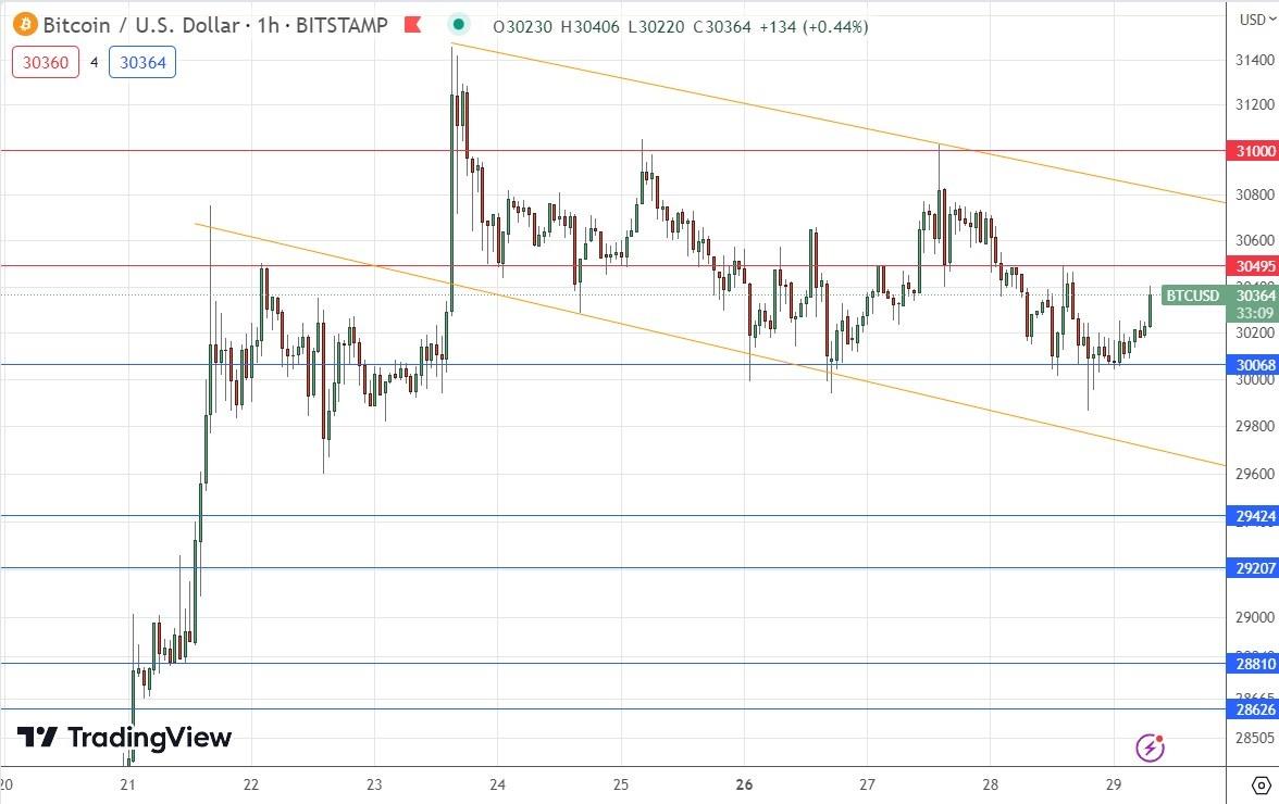 my previous btc/usd signal on 14th june was not triggered as none of the key support or resistance levels were reached that day.today's btc/usd signalsrisk 0.50% per trade.trades must be taken prior to 5pm tokyo time friday.long trade ideas long entry after a bullish price action reversal on the h1 timeframe following the next touch of $30,068, $29,424, or $29,207. place the stop loss $100 below the local swing low. adjust the stop loss to break even once the trade is $100 in profit by price. remove 50% of the position as profit when the trade is $100 in profit by price and leave the remainder of the position to run.
