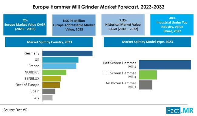 According to Fact.MR, a market research and competitive intelligence provider, the Europe hammer mill grinder market is estimated at US$ 97 million in 2023 and is expected to expand at an impressive CAGR of 2% during the forecast years of 2023-2033.