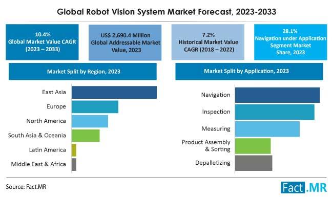 In 2023, the market for robot vision systems will be valued at US$ 2,690.4 million, and it is anticipated that it will grow at a CAGR of 10.4% to reach US$ 7,236.2 million by the end of 2033.