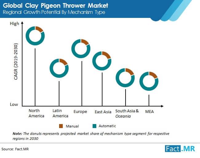 Fact.MR's study has done a segmentation of the clay pigeon thrower market on the basis of mechanism type, launch angle, throwing capacity, and sales channel, across seven regions.