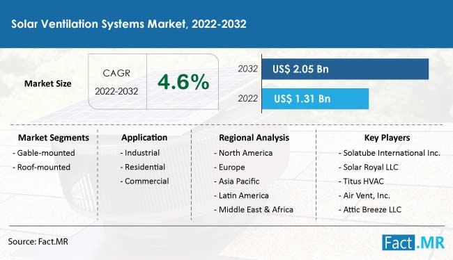 Fact.MR, a supplier of market research and competitive data, projects that from 2022 to 2032, global demand for solar ventilation systems will grow at a CAGR of 4.6%. In 2022, the market for solar ventilation systems was valued at US$1.31 billion. By 2032, it is anticipated that the market will be worth US$2.05 billion.