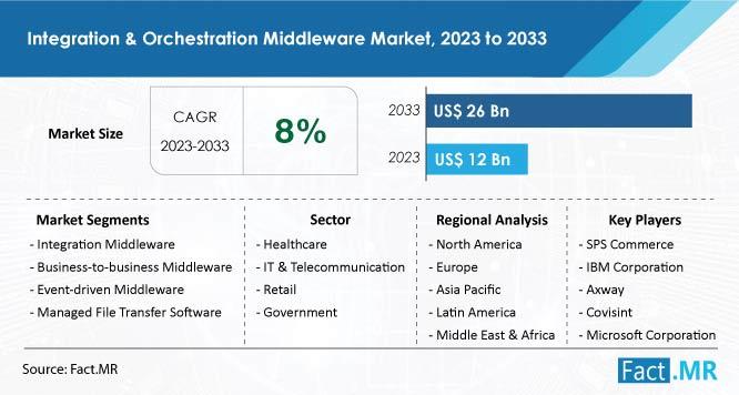 The global integration & orchestration middleware market has reached a valuation of US$ 12 billion in 2023 and is expected to climb to US$ 26 billion by the end of 2033, expanding briskly at a CAGR of 8% from 2023 to 2033.