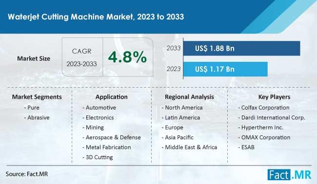 In 2023, waterjet cutting machine market will be worth US$1.17 billion. By the end of 2033, the market for waterjet cutting machines is expected to be worth US$1.88 billion, growing at a CAGR of 4.8%.