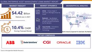 Global enterprise asset management (eam) market was valued at USD 4.42 billion in 2021 and is expected to reach USD 8.83 billion by the year 2028, at a CAGR of 10.4%.