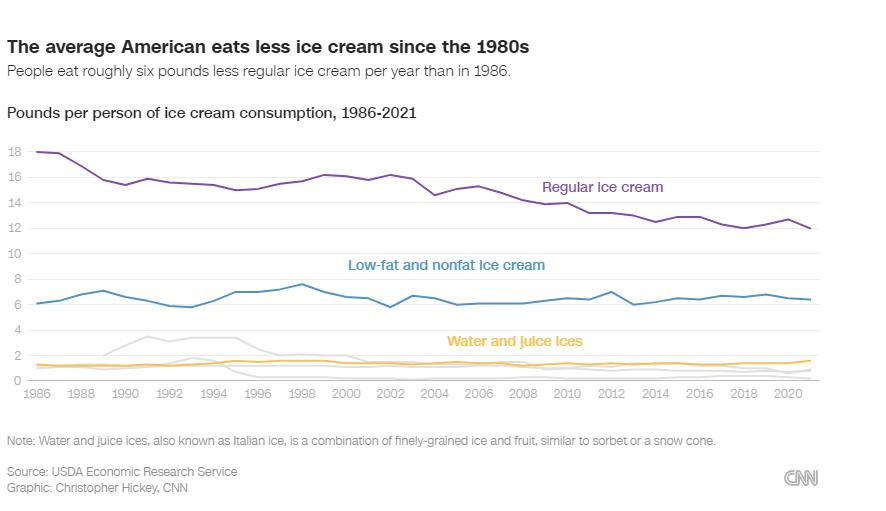 In 1986, the average American ate 18 pounds of regular ice cream, according to the USDA. By 2021, the most recent year of the data, that was down a third to just 12 pounds per person.