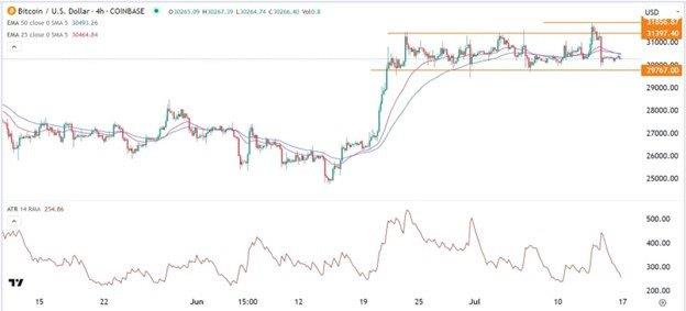 read full review get started Fed and SEC DefeatTwo important things happened in the financial market last week. First, the US published encouraging consumer price index data. According to the Bureau of Labor Statistics (BLS), the headline inflation dropped to 3.0% in June while core inflation dropped to 4.8% during the month.These numbers came a few days after the US published soft jobs numbers. Therefore, risky assets like stocks rose as investors assessed the potential actions of the Federal Reserve. Before these numbers, most analysts were expecting the Fed to hike rates two more times this year. Now, I believe that the bank will deliver one more hike and then take a strategic pause.The other important event was the decision by a US judge to offer a partial victory to Ripple Labs. In her ruling, the judge said that the company and its executives violated American laws when they raised money in 2013. That ruling will attract a huge fee to the parties.On the other hand, she ruled that XRP was not a security. This was the first time that the sec suffered a major defeat in the crypto industry.Bitcoin was not a party in this litigation since all regulators believe that the coin is not a security. Instead, the CFTC and the SEC believes that it is a digital commodity. However, the ruling provided some relief to traders, which pushed the fear and greed index to the highest level in months.BTC/USD Technical AnalysisThe BTC/USD pair has been in a tight range in the past few days. It initially jumped to 31,856 last week after the US inflation data and the Ripple Labs ruling. The pair then retreated to above 30,000 as the bullish momentum faded.Bitcoin has retreated below the 25-period and 50-period moving averages . It remains slightly above the important support level at 30,000 and this month's low of 29,767. The Average True Range (ATR) has moved to the lowest level since last week. Therefore, the outlook of the pair is neutral with a bearish bias since it has formed a flag pattern. A bearish breakout will be confirmed if it moves below 29,767. Ready to trade our free trading signals ? We've made a list of the best forex crypto brokers worth trading with.
