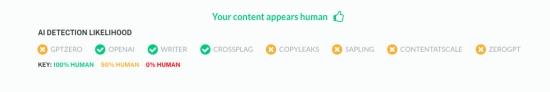 The tool has officially scored 100% human written scores according to tests ran on Originality.ai