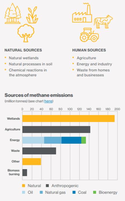 Sources of methane emissions Some methane emissions occur naturally, arising from sources such as wetlands. But most methane emissions released over the past two centuries have been produced by human activity (~60%), including agriculture and the production of energy from coal and fossil fuels.