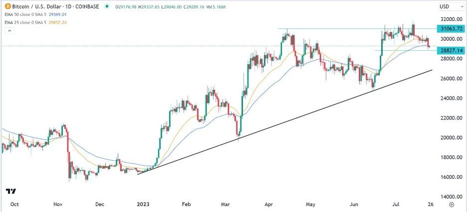 They jumped on Tuesday after China, the second-biggest economy in the world, announced a new plan to support its businesses. Bitcoin is underperforming mostly because the crypto market has been muted in the past few days, without major news. The most recent news came two weeks ago when Ripple prevailed in its long lawsuit against the SEC.The next key catalyst that could move Bitcoin is the Federal Open Market Committee (FOMC) decision scheduled for later today. Economists polled by Reuters and Bloomberg have priced in a 0.25% rate hike that will push rates to the highest level in over two decades.The Fed will likely signal the end of the tightening phase since inflation is falling at a faster pace than expected. It dropped to 3.0% in June from a peak of 9.1% in 2021.Bitcoin will also react to the upcoming options expiry in the market. Options worth millions of dollars will expire on Friday, leading to some volatility in the crypto market.BTC/USD technical analysisThe BTC/USD pair drifted downwards as demand for Bitcoin waned. This performance is likely because of the rotation from crypto to stocks. On the daily chart, the pair has formed a small head and shoulders pattern.