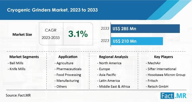 The global cryogenic grinders market amounted to US$ 1.5 billion in 2023. The market for cryogenic grinders is set to touch US$ 4 billion by 2033. Worldwide demand for cryogenic grinders is predicted to surge at a CAGR of 10.3% from 2023 to 2033. North America is projected to witness significant growth in the global cryogenic grinders market.