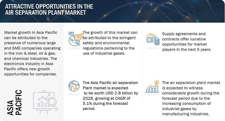 The need for medicinal gases produced by air separation plants, such as oxygen and nitrogen, is driven by the region’s expanding population and rising healthcare spending in Asia. Medical technology has advanced in the Asia Pacific region, which has led to a greater reliance on medical gases in a variety of diagnostic and therapeutic applications. These gases are utilized in hospitals, clinics, and other healthcare facilities for anesthesia, respiratory therapy, and other medical operations. The demand from the healthcare industry is driving the air separation plant market in the region.