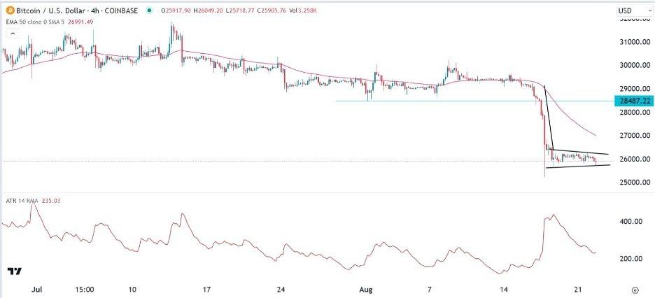 Bitcoin price remained under intense pressure this week as demand, volatility, and volume continued falling. The BTC/USD pair retreated to 25,932, which was much lower than last week's high of almost $30,000.Bitcoin's consolidation coincided with the decline in American equities as investors waited for the upcoming Jackson Hole Symposium. The Dow Jones index fell by 142 points on Tuesday while the S&P 500 fell by 20 basis points. At the same time, thedollar index surged to $103.46 while the VIX jumped to $17.A key concern among investors is that there is low demand for Bitcoin in both centralized and decentralized exchanges (DEX). Data published by The Block shows that the volume of cryptocurrencies traded in key exchanges dropped to the lowest level since 2021 in July.The next likely catalyst for the BTC/USD pair will be the upcoming Jackson Hole Symposium. This is an important meeting that brings in top economists and central bank officials. The statement by Jerome Powell will provide guidance on what to expect in the coming months.BTC/USD technical analysisThe 4H chart shows that the BTC/USD pair has been in a strong bearish trend in the past few days. It crossed the important support level at 28,487 (August 1 low) on Friday. The pair has remained below the 50-period moving average.Most importantly, the BTC/USD pair has formed a bearish flag pattern that is shown in black. This pattern is characterized by a flag pole and a flag-like pattern. The Average True Range (ATR) has retreated, signaling that volatility is falling.Therefore, the pair will likely continue falling as sellers target the key psychological level at 25,000.Bitcoin price forecastThe daily chart shows that the BTC/USD pair formed a double-top pattern. In price action analysis, this pattern is one of the most bearish signs. The pair has also dropped below the ascending trendline that connects the lowest levels since January this year.It has also moved below the 50-day and 200-day moving averages while the Relative Strength Index (RSI) has moved to the oversold level. The pair will likely continue falling, with the next target being at 24,770 (June 15 low).Ready to trade our free forex signals ? Here are the best mt4 crypto brokers to choose from.