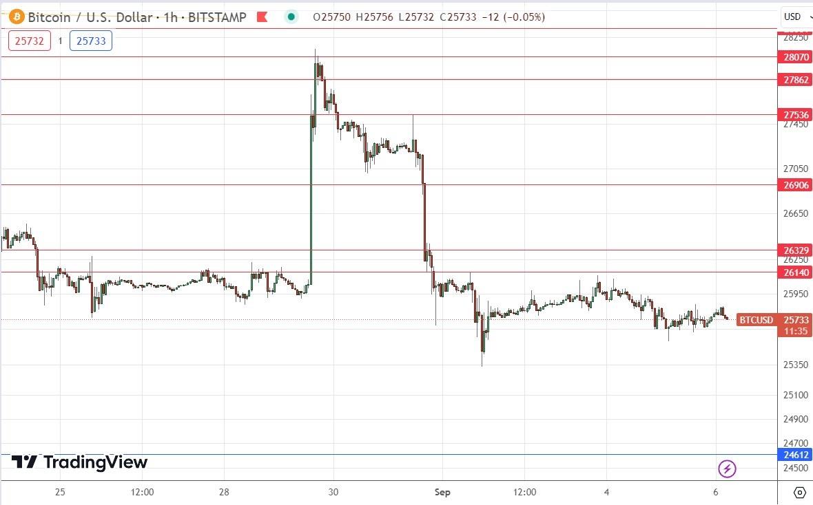 that occurs at the given levels.BTC/USD AnalysisI wrote in my previBTC/USD analysis that it would not be a surprise if the price turned bearish at its current peak as this area was infective when last reached some hours ago. I also saw short trades as only likely to work out if taken from a reversal at a resistance level above the current price.This was a good call, as it produced a profitable short trade – very profitable, if left to run.The technical picture has become considerably more bearish as recent weeks have seen the price make a convincing long-term reversal as it continued to fail to get established above the $30k round number and confluent area of resistance.Following this bearish reversal, the price began to move down gently within a wide bearish price channel before making a decisive breakdown below that channel in mid-August.The price has continued to drift lower, reflecting a weakness in Bitcoin even as other risky assets begin to recover, although theDollar remains quite strong and is another factor continuing to drive the price down.The price has now reached an area in which it looks to be comfortable, so I expect sideways trading today with a minor bearish bias.I see the best opportunity which might set up today to be a short trade from another bearish reversal at the nearest resistance level at $26,140.Concerning theDollar, there will be a release of ISM PMI data at 3pm London time.Ready to trade our daily Bitcoin signals ? Here's our list of the best crypto brokers worth looking at.