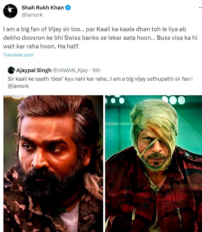 A fan asked SRK:“Sir kaali ke saath 'deal' kyu nahi kar rahe... I am a big Vijay Sethupathi sir fan!”