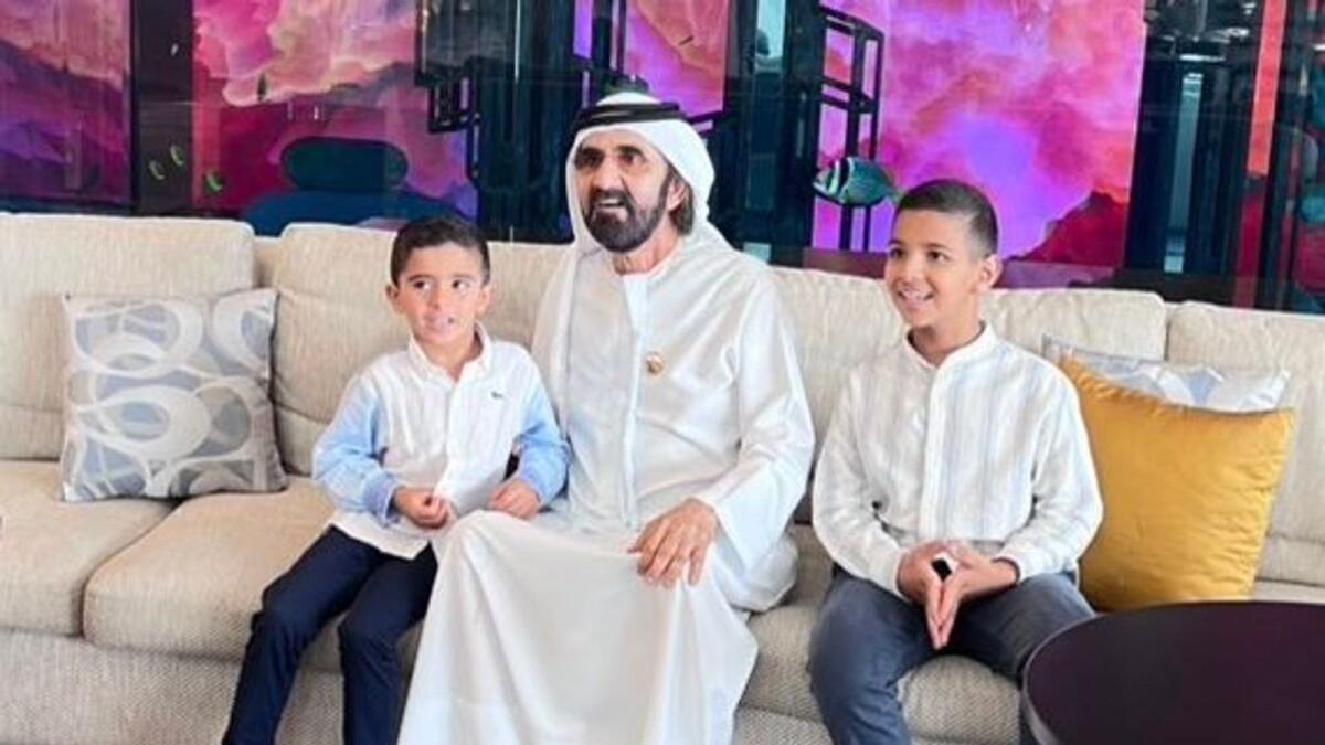 In another photo, the kids are seated on either side of the Ruler. Badr seems to be comfortable with Sheikh Mohammed, beaming and leaning on him.