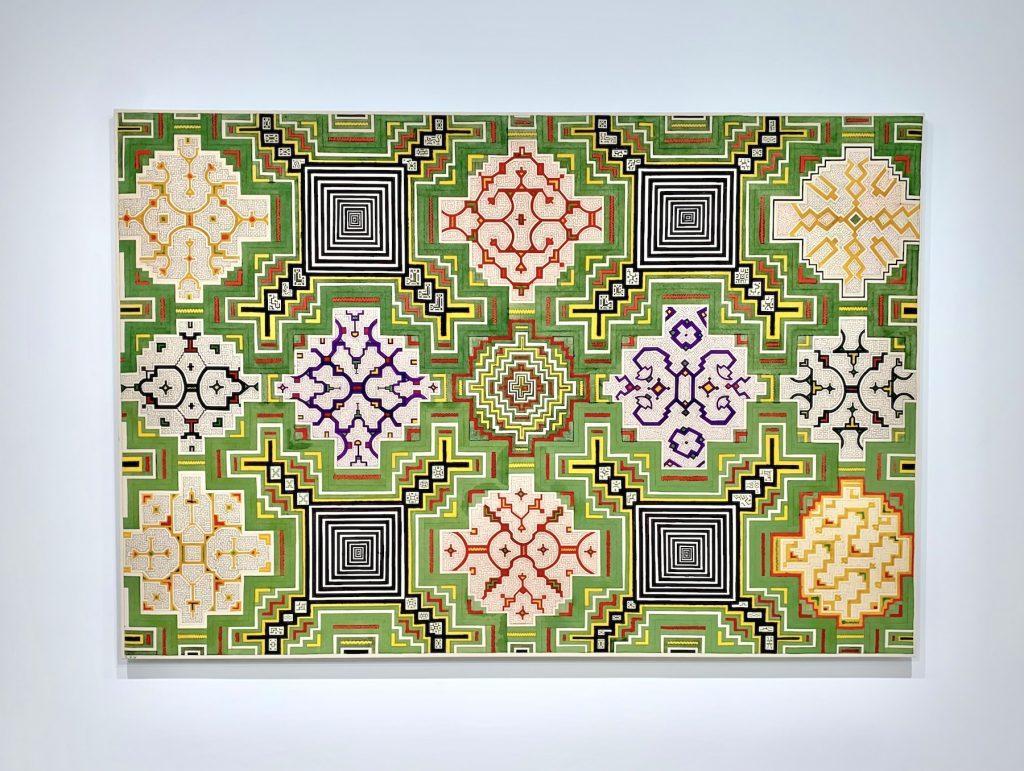Catching up to Kené I only know about Sara Flores's abstractions what I read in the gallery material for her show,“Soi Biri,” at Clearing (on view through October 22): that the artist hails from the Shipibo-Conibo people of the Peruvian Amazon; that the artworks draw on , a visual language of intricate, all-over, maze-like designs; that the vibrating patterns connect symbolically to the characteristic hallucinations seen in an ayahuasca ceremony; that the finished paintings are meant to have healing properties; that their medium,“vegetal pigments on wild cotton,” also suggests a closeness to nature.