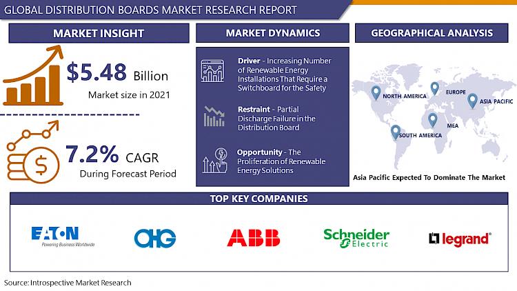 Global Distribution Boards Market was valued at USD 5.48 billion in 2021 and is expected to reach USD 8.92 billion by the year 2028, at a CAGR of 7.2%. Analysis period {2023-2030}