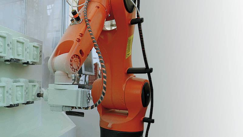 A six-axis, articulated robot arm can follow complex contours. Using a high-speed, rotating deburring bit, such a system is highly effective at cutting plastics and composite materials, even after the material has been molded into a complicated surface.