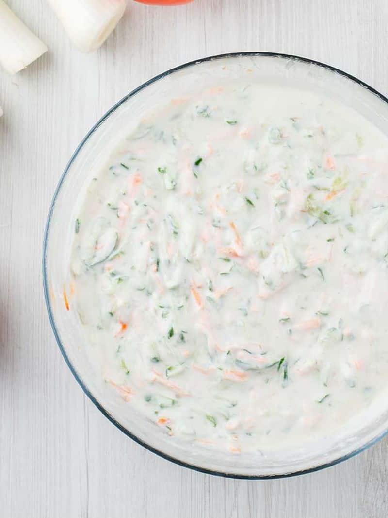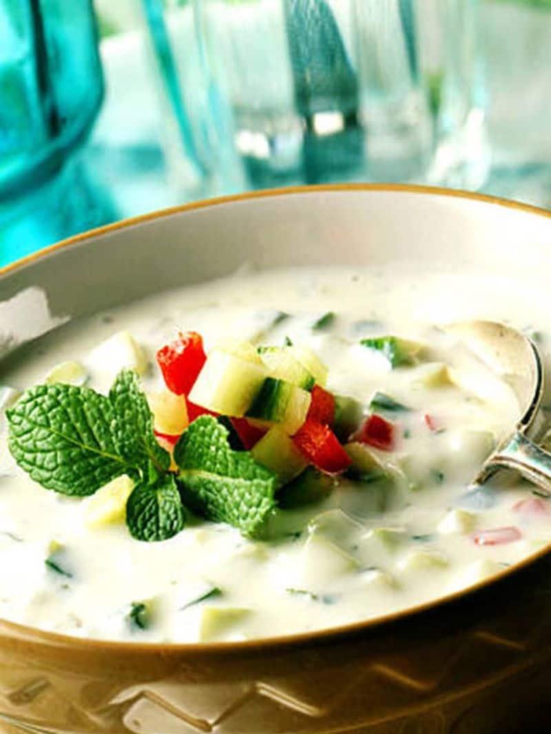 Prepared by adding finely chopped onion and tomato in the yogurt. Spices like pepper, cumin powder, salt and dried mint powder are added to enhance the taste.