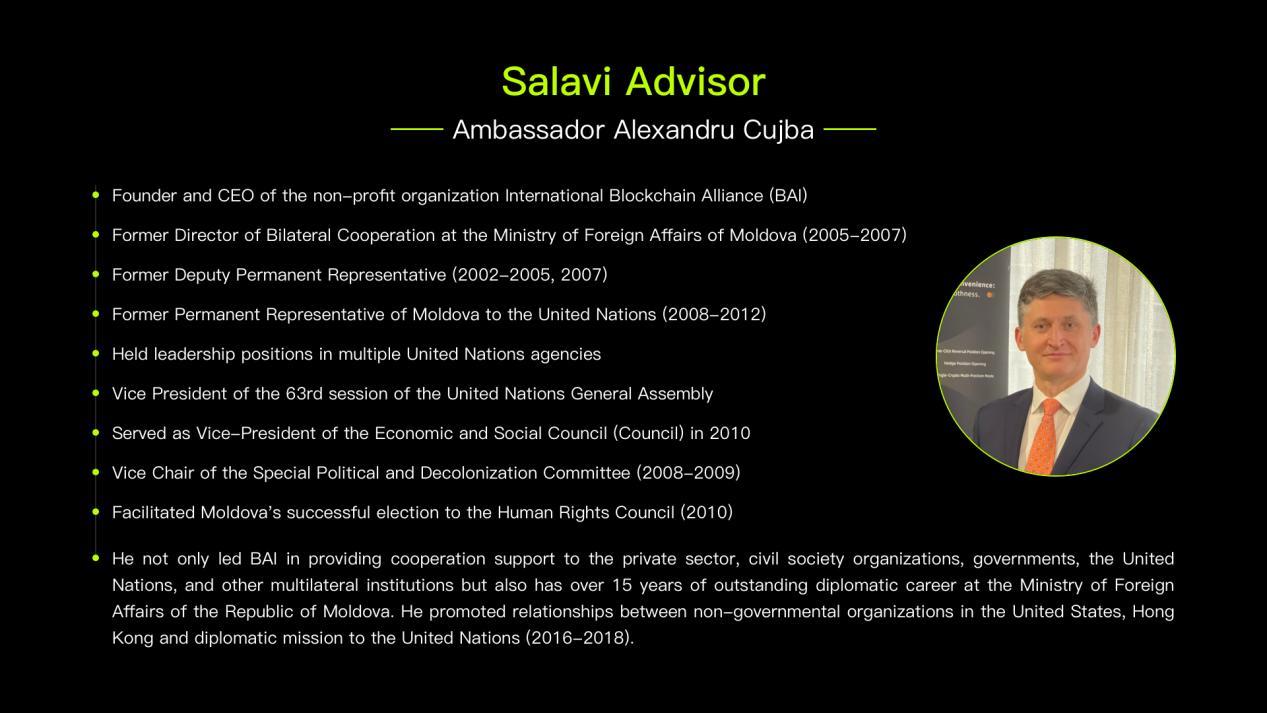 The inclusion of former United Nations representative Cujba in Salavi represents a historic collaboration. Mr. Alexandru Cujba is a highly respected former Permanent Representative of Moldova to the United Nations (2008-2012) and the founder and CEO of the non-profit organization International Blockchain Alliance (BAI). He has held important positions such as Director of Bilateral Cooperation at the Ministry of Foreign Affairs of Moldova (2005-2007), Deputy Permanent Representative (2002-2005, 2007), Vice President of the 63rd session of the United Nations General Assembly, Vice President of the Economic and Social Council (2010), Vice Chair of the Special Political and Decolonization Committee (2008-2009), and leadership roles in several United Nations structures.