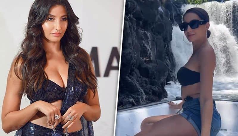 Nora was seen posing in a black tube bra, denim shorts and had her sunglasses on as she was seen enjoying her vacation.
