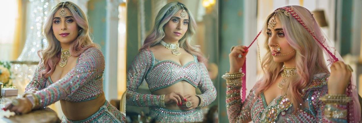 The three minute 43 second video is a mesmerising wedding song, featuring Neha in the avatar of a bride. She looks beautiful in a green and pink heavily embroidered lehenga, with matching jewellery. Her hair is left open with pink streaks.