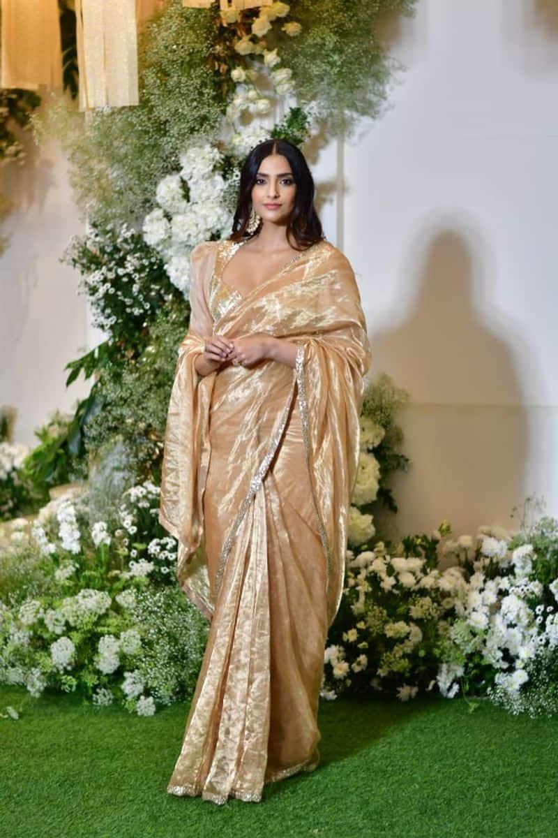 Bollywood actress Sonam Kapoor in a golden saree at fashion designer Manish Malhotra's Diwali bash on Sunday, 05 November.