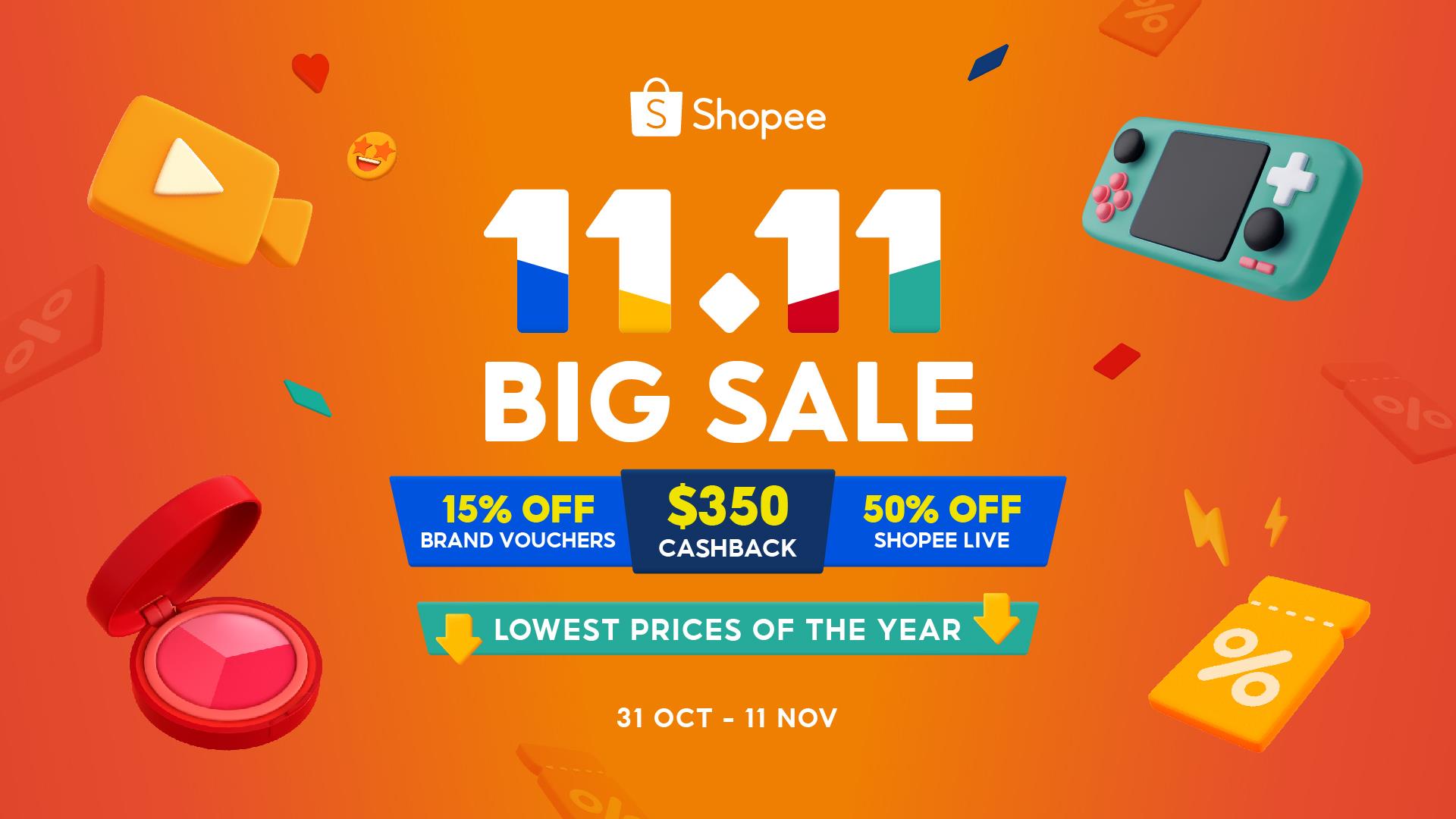 11.11 Big Sale 2023 will present Shopee's greatest selection of deals, fun, and entertainment for everyone, and shoppers can look forward to the widest variety of discounted products from over 25 categories, as well as 15% off brand vouchers, $350 cashback, and 50% off Shopee Live.