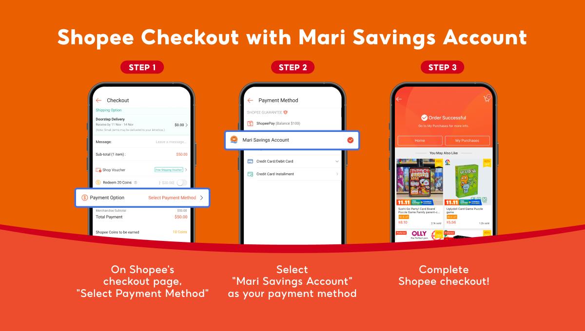 This feature makes shopping on Shopee even better by simplifying the payment process. With just a tap of a button, shoppers can easily pay for their purchases through funds that will be deducted directly from their Mari Savings Account.