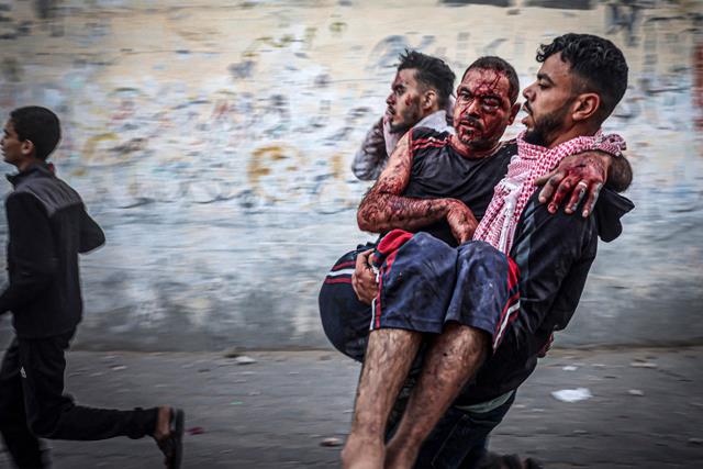 Medical workers treated bloodied, dust-covered survivors as other residents fled through debris-strewn streets to safety.