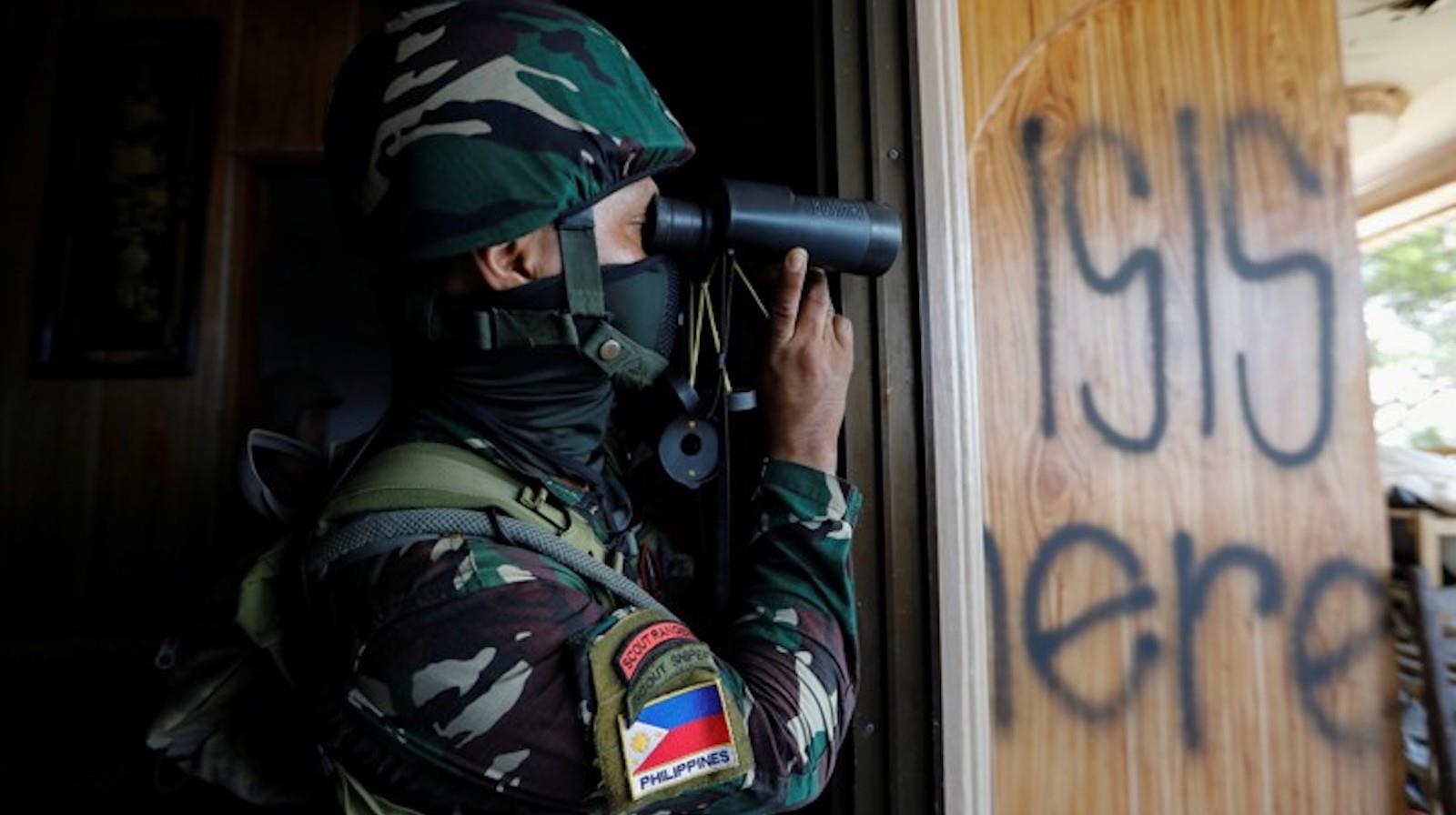A Filipino soldier uses binoculars during the siege of Marawi City by Islamic State-aligned militants, July 1, 2017. Photo: Twitter
