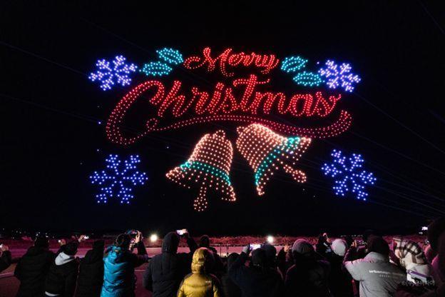 The world's largest Merry Christmas display created using drones, forming a stunning and festive aerial spectacle in the night sky.