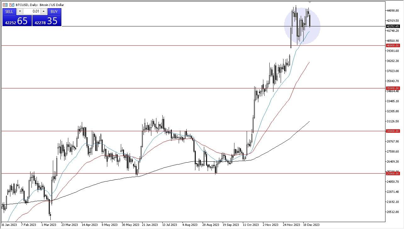 - Bitcoin faced a notable decline in its trading session on Tuesday, with prices reaching the 20-Day Exponential Moving Average indicator. This indicator has garnered substantial attention amid Bitcoin's remarkable uptrend. Importantly, it remains comfortably above the critical $40,000 threshold, a significant psychological level that naturally garners considerable market focus.